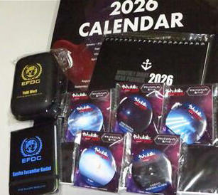パンフレットに入場者特典、巾袋、クリアファイル。