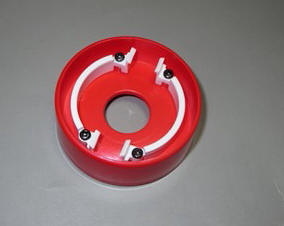 赤い円形パーツに白いリングの半分2個をしっかりとはめ込んでネジで締めて固定してあげます。