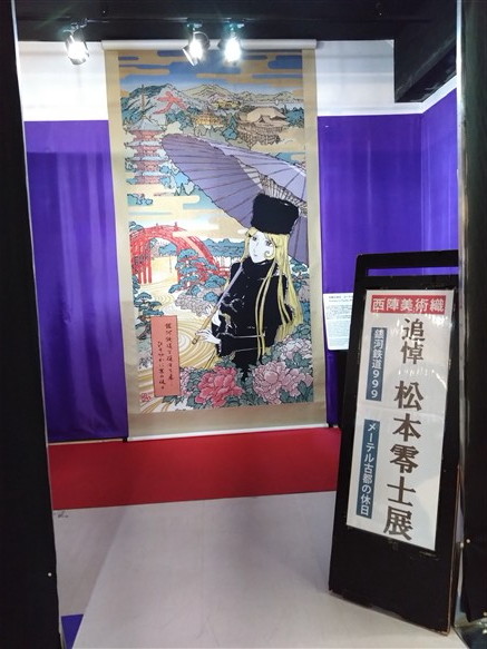 右に「追悼 松本零士展」と看板があり、右壁に松本零士先生が西陣織の作品を持った写真が飾られている。