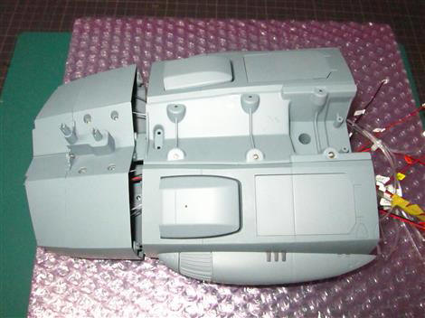 波動砲口から伸びている光ファイバー8本とコード2本を艦尾側へ真ん中に通してあげます。